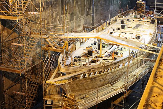 Entrée en chantier en novembre dernier, la goélette Etoile va être remise à l’eau le 17 avril. Après La Grande Hermine et le Mutin, c’est le troisième voilier-école de la Marine Nationale à passer entre les mains des charpentiers du Guip. L’Etoile a bénéficié du plus grand carénage réalisé depuis une quarantaine d’années. Le chantier du Guip a ainsi effectué la dépose et le changement complet du pont de travail et de la dunette, en lattes de pin d’Oregon, ainsi que le remplacement d’une partie des barrots et des plats-bords en chêne. Il a par ailleurs construit un nouveau roof passerelle, utilisé par les élèves pour la navigation. Un nouveau mât de flèche en pin d’Oregon a également été fabriqué. La carène a été entièrement contrôlée et les renforts de liaison repris. L’électronique embarquée a été modernisée par le chantier du Guip alors que l’électricité a bénéficié d’une refonte complète réalisée par la société Navtis, co-traitant avec le chantier du Guip sur ce marché. Celle-ci s’est également occupée de la partie mécanique : révision du moteur principal, du guindeau et changement des groupes électrogènes. « Ce chantier a représenté 18 000 heures de travail », précise Yann Mauffret, le patron du Guip. L’Etoile restera à quai pour matage et essais devant le chantier du Guip jusqu’au 7 mai. En 2015, la Belle Poule bénéficiera à son tour d’un grand carénage.