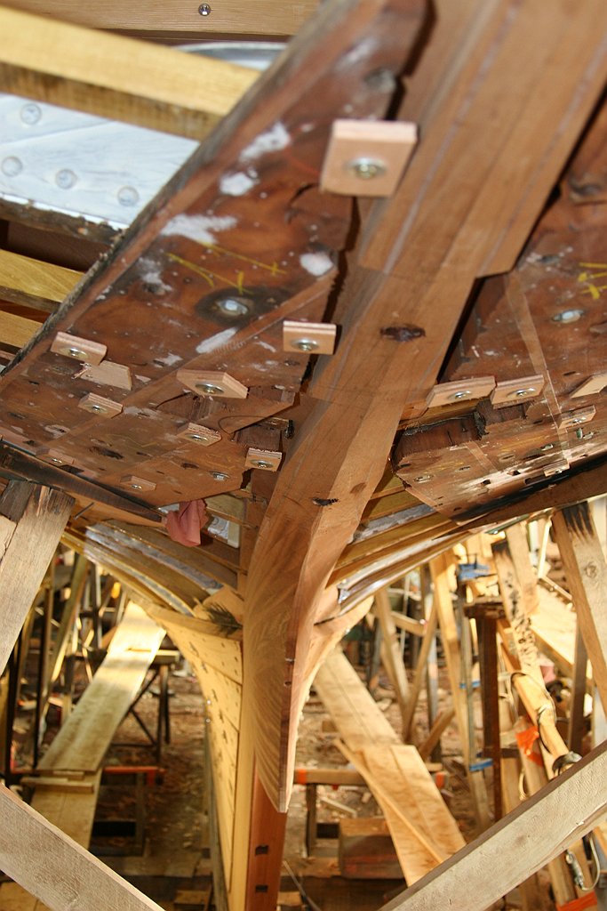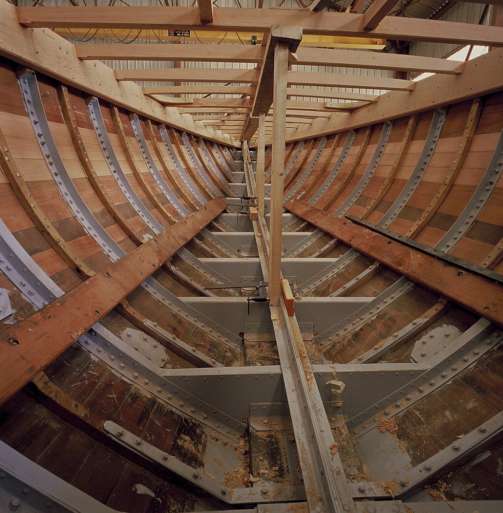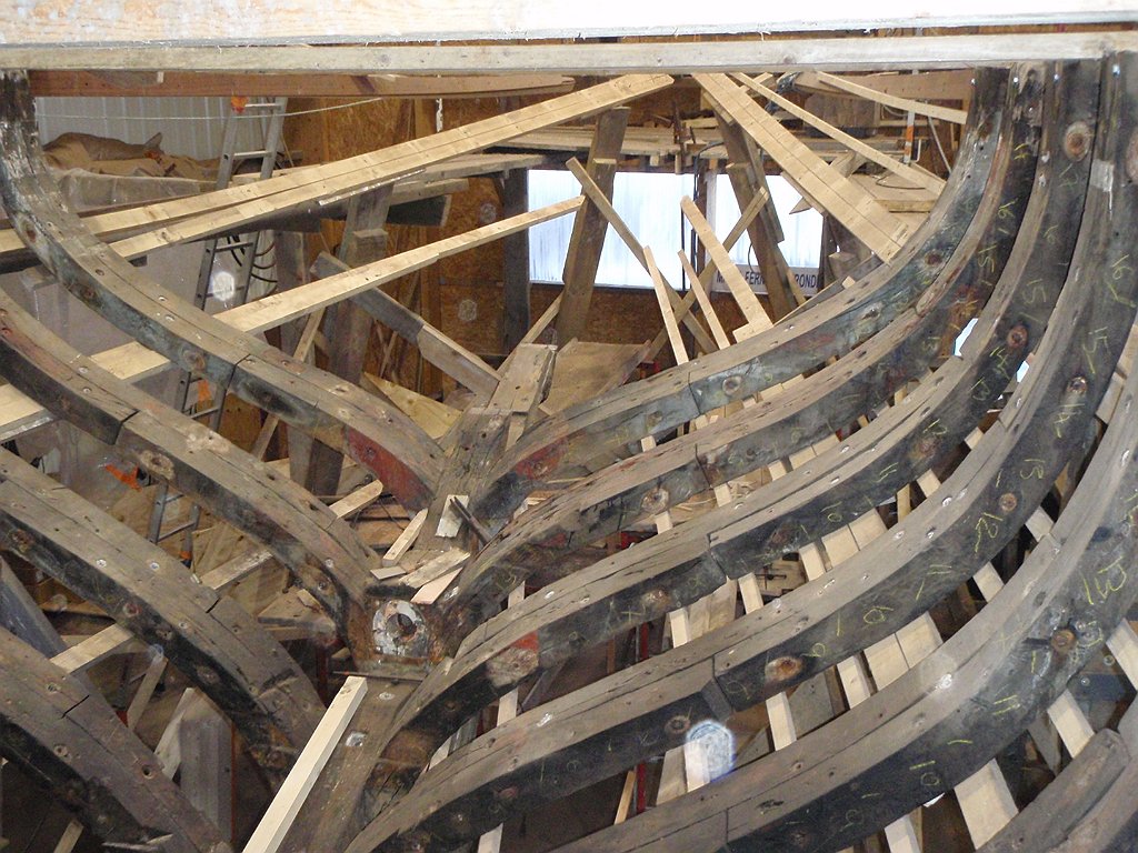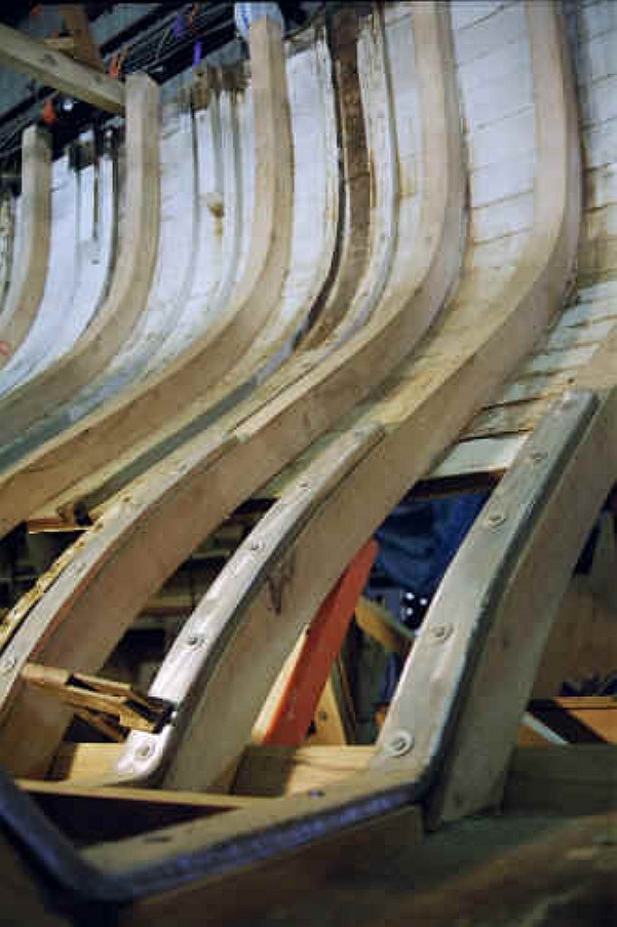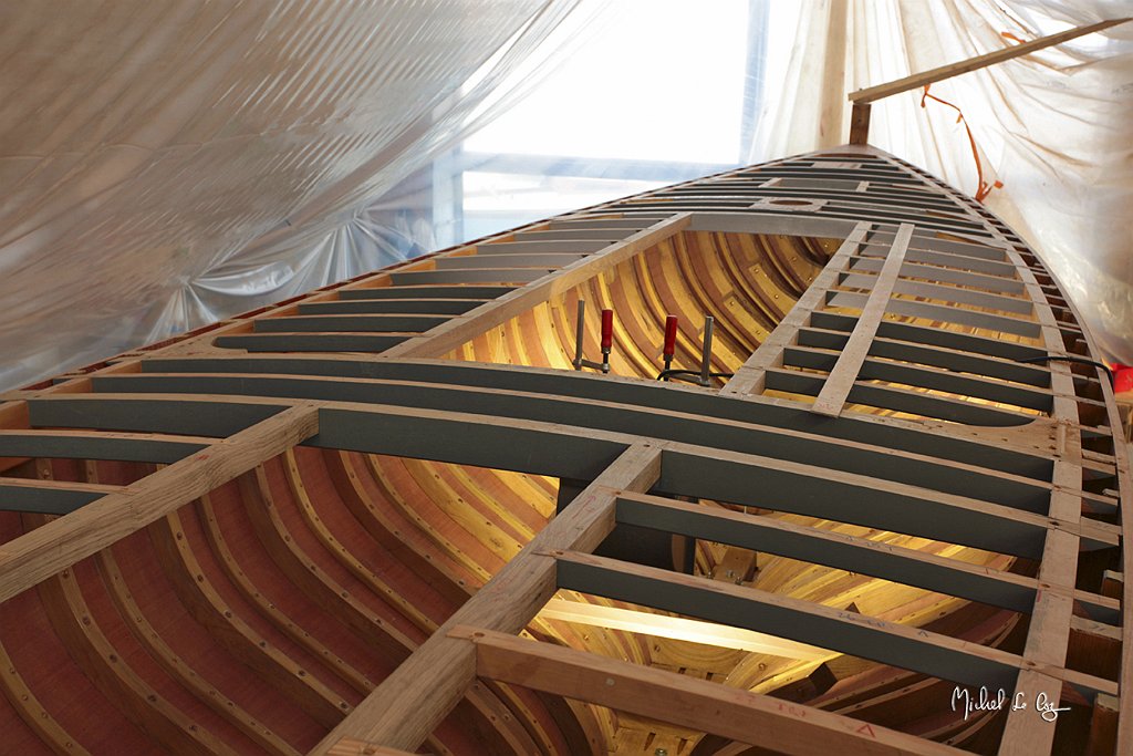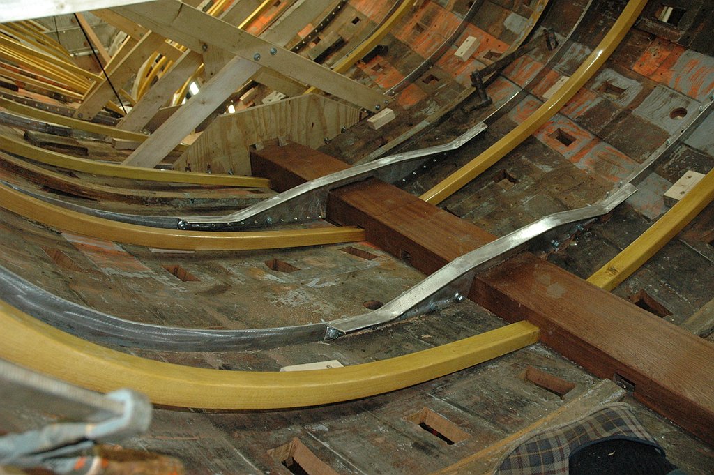 Construction en bois classique. Membrures métalliques cintrées et rivetées à chaud.