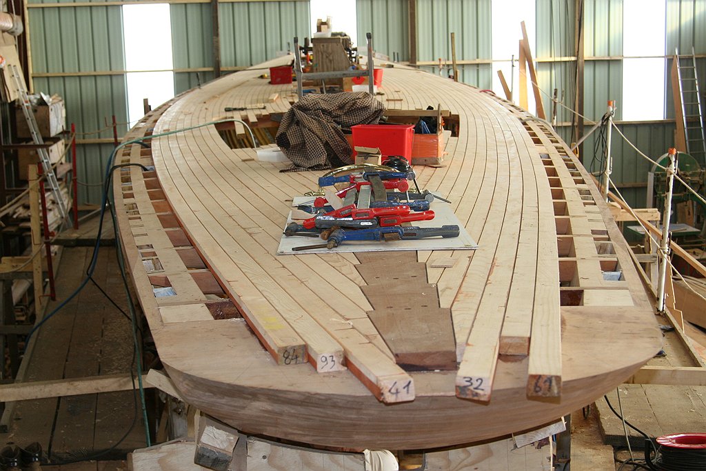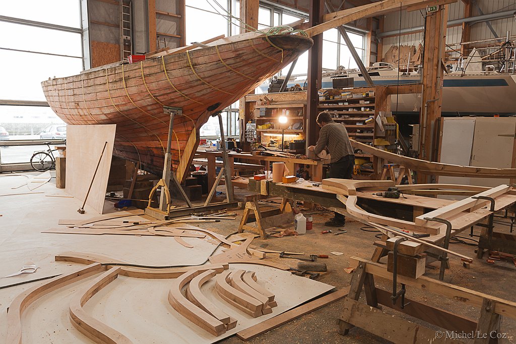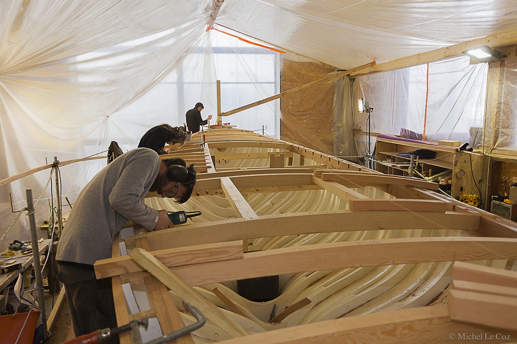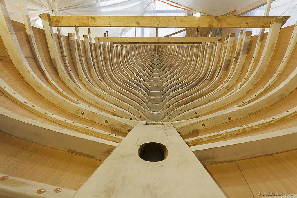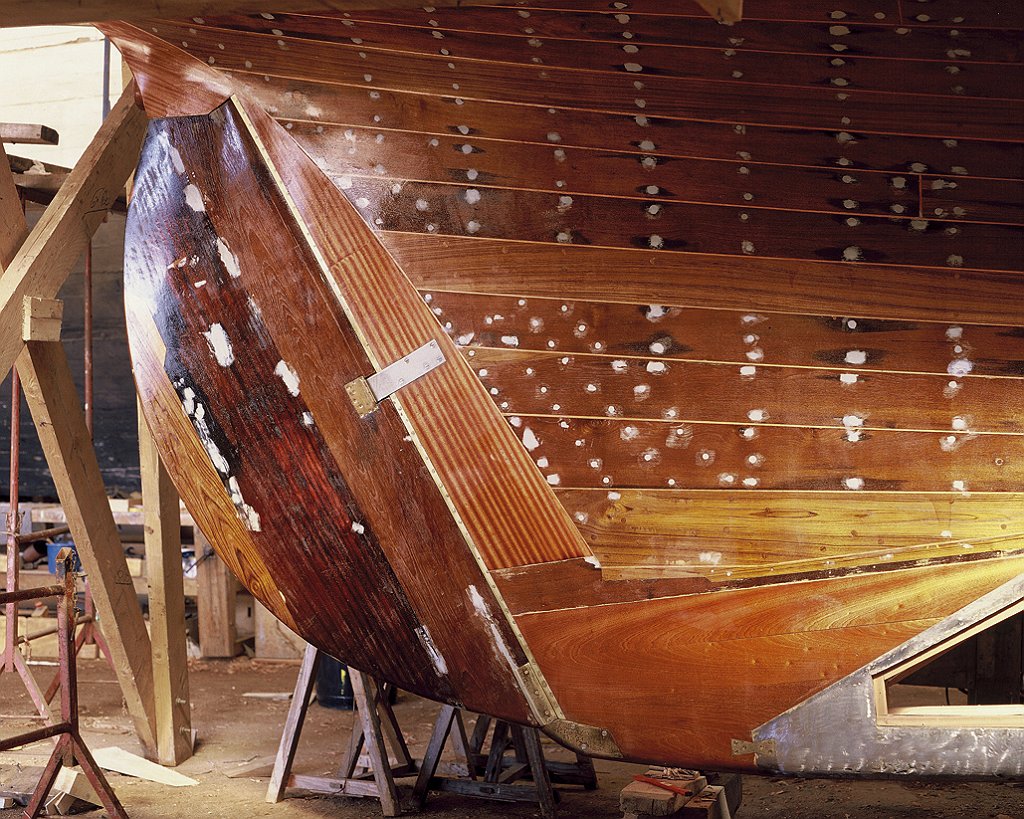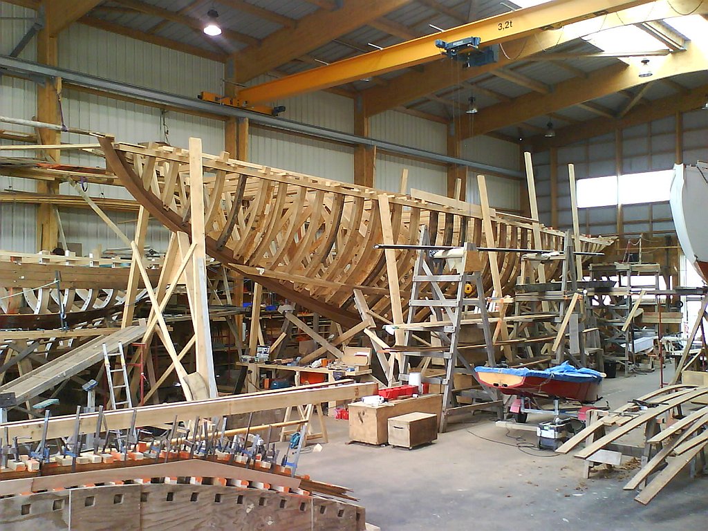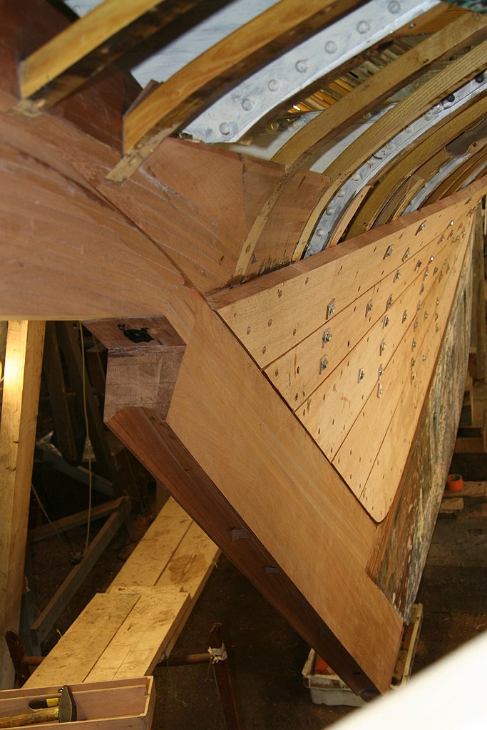 Construction en bois classique. Membrures métalliques cintrées et rivetées à chaud.