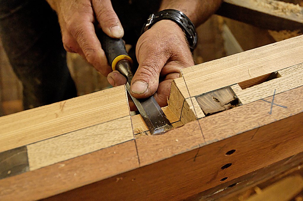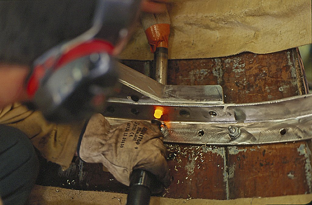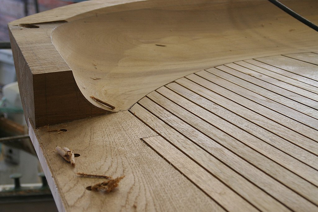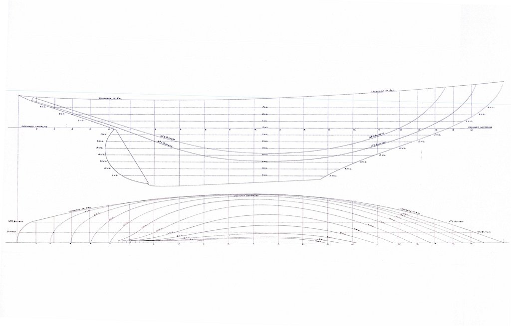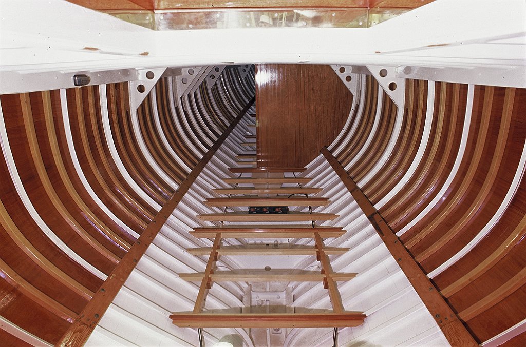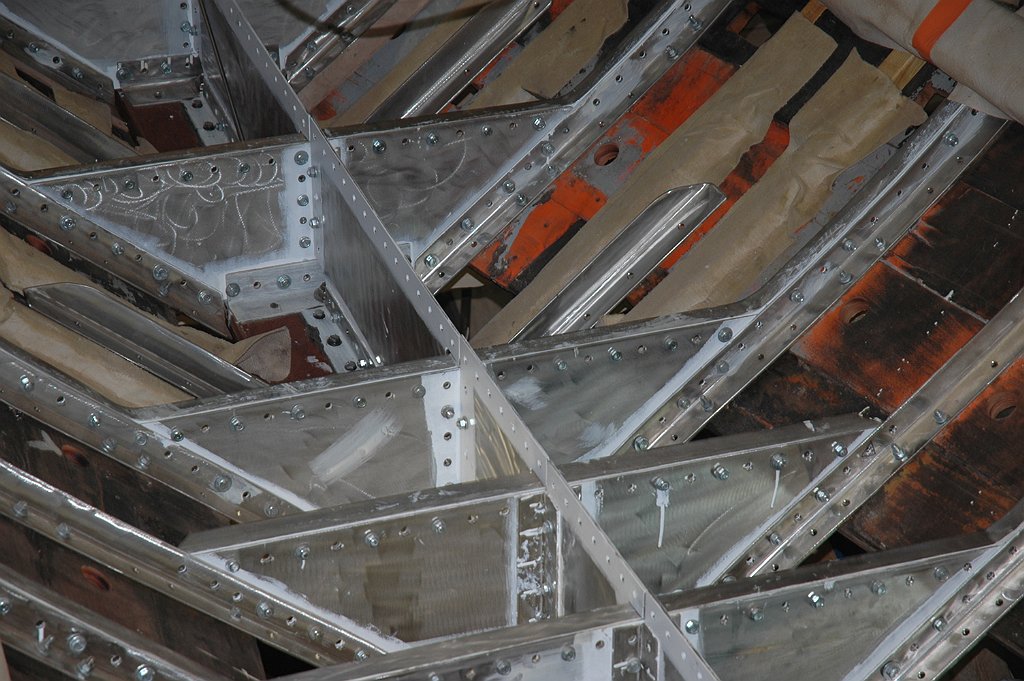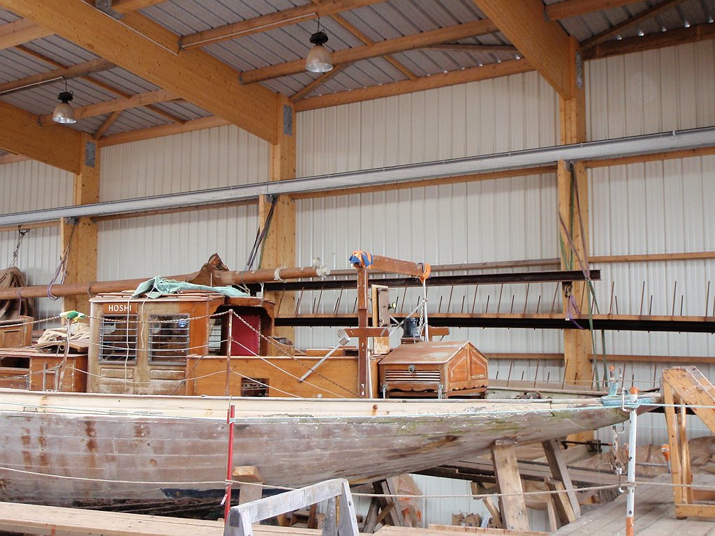 Construction en bois classique. Membrures métalliques cintrées et rivetées à chaud.