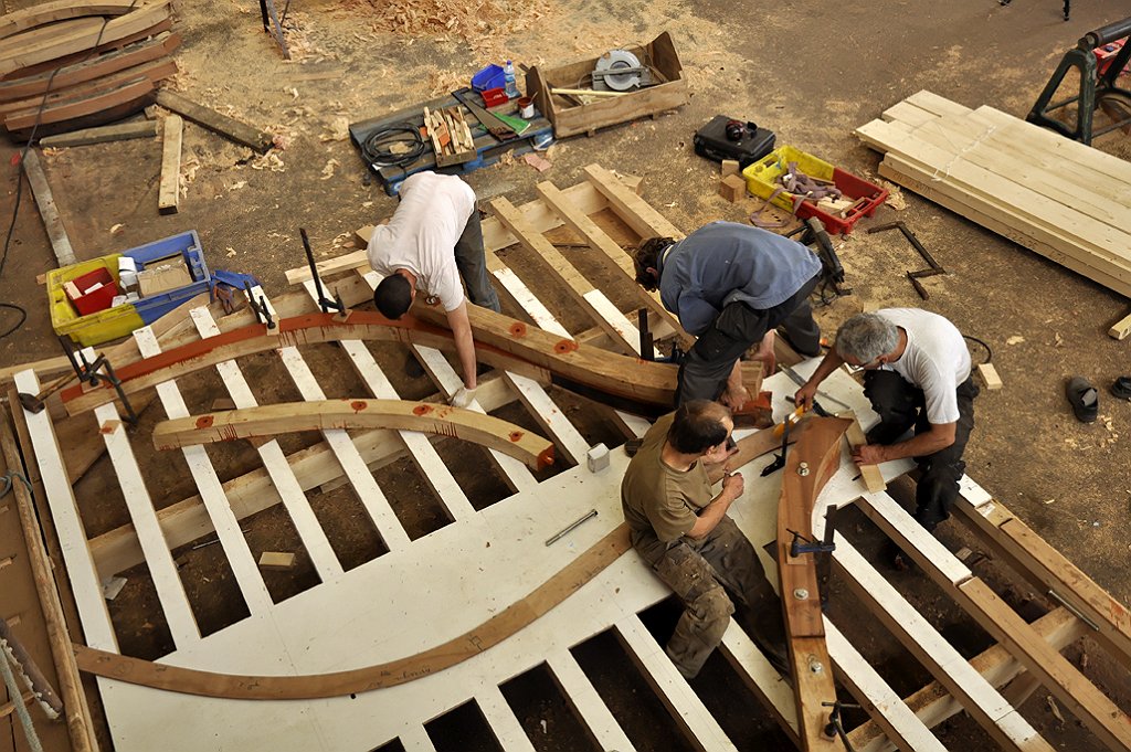Construction en bois classique, membrures métalliques cintrées et rivetées à chaud.